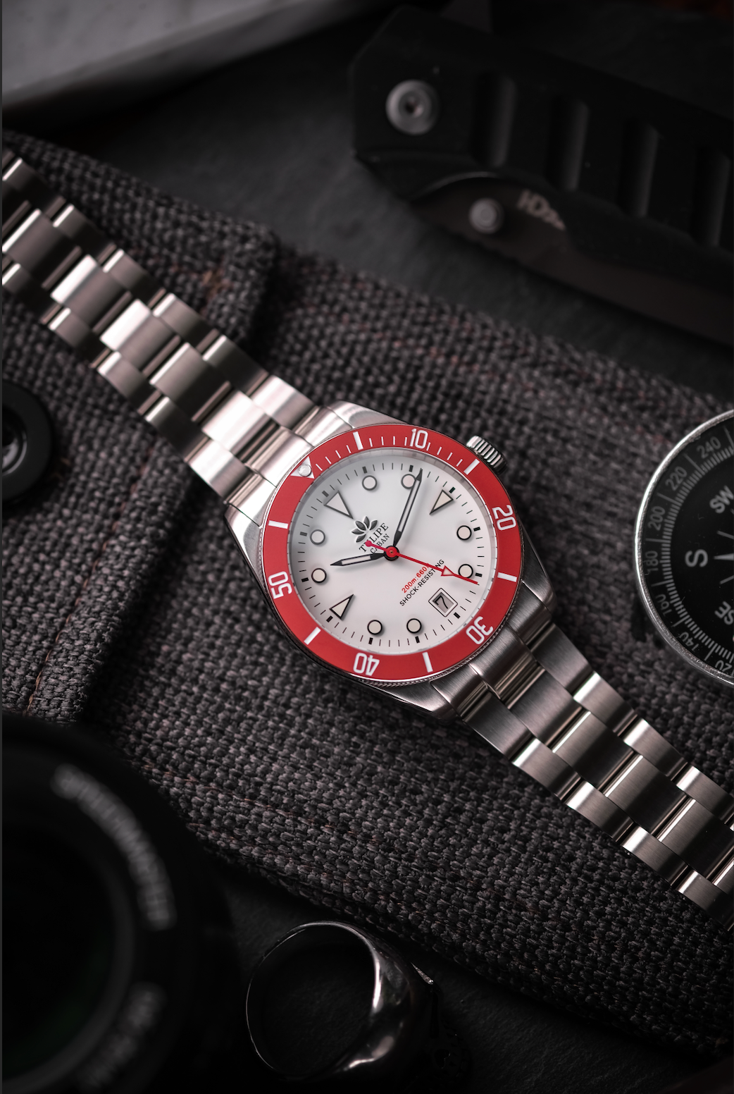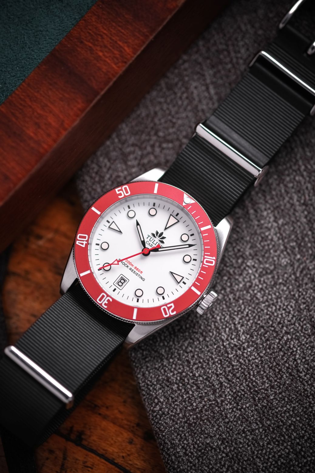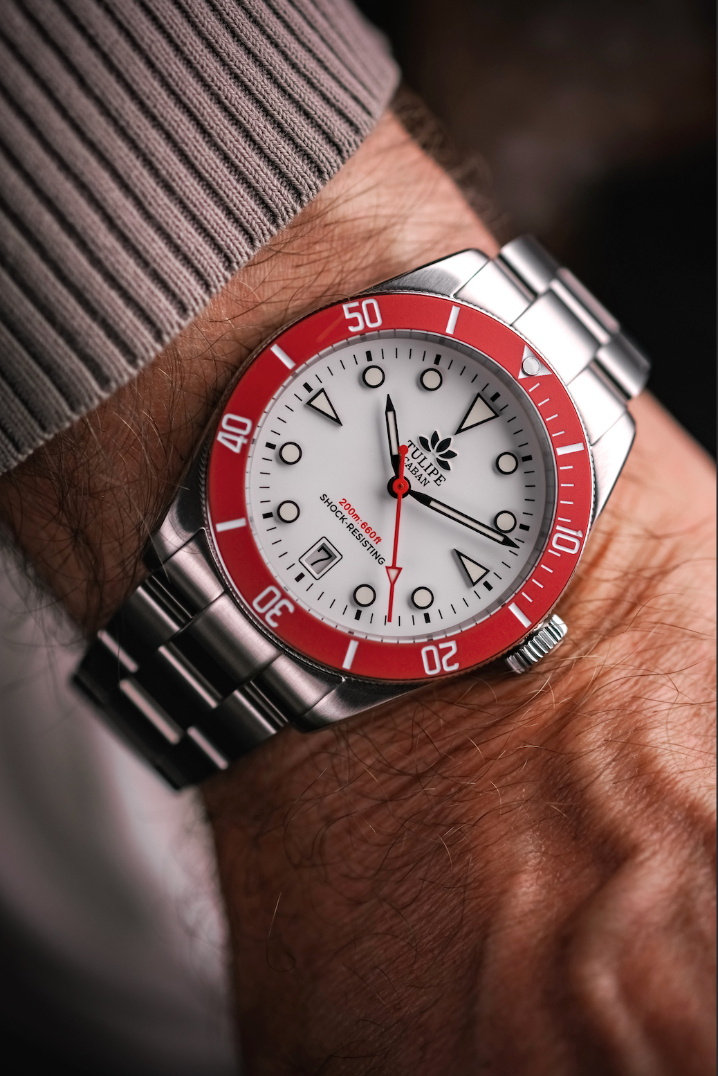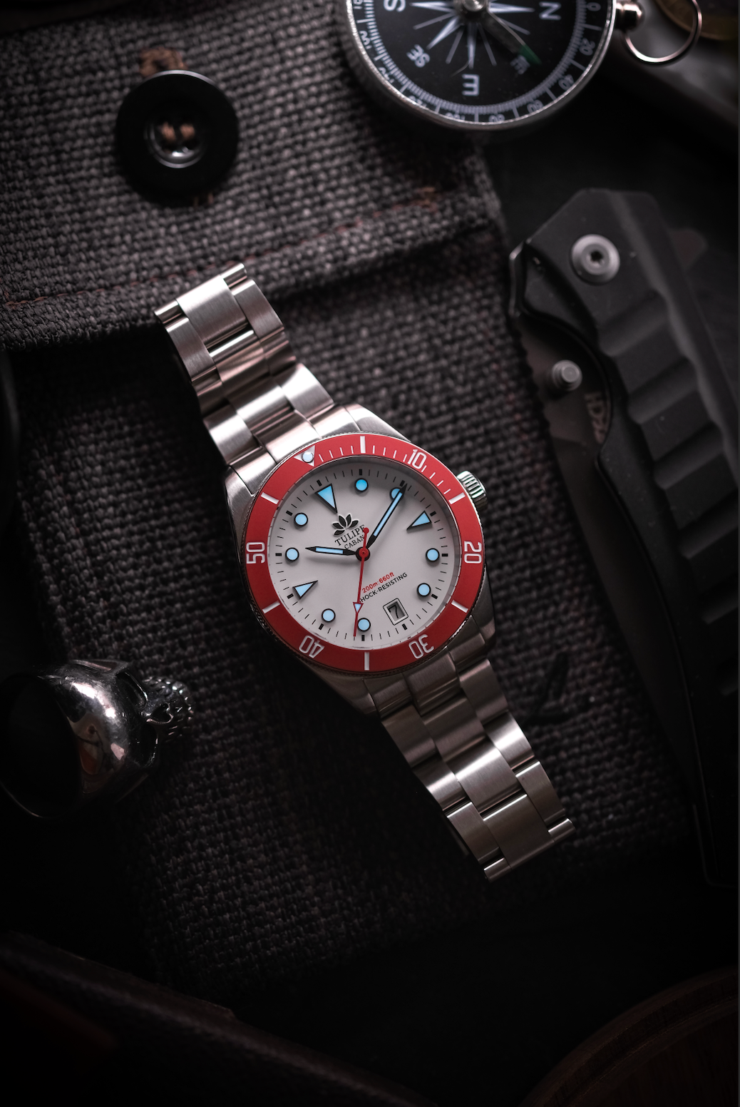 Il primo diver di casa Tulipe reinterpretato con una cassa da 38,5mm , ridotto di spessore, dial bianco ghiaccio, una lunetta in ceramica opaca rossa e con un illuminazione blu in modo da essere leggibile anche nelle condizioni di illuminazione più difficoltose.