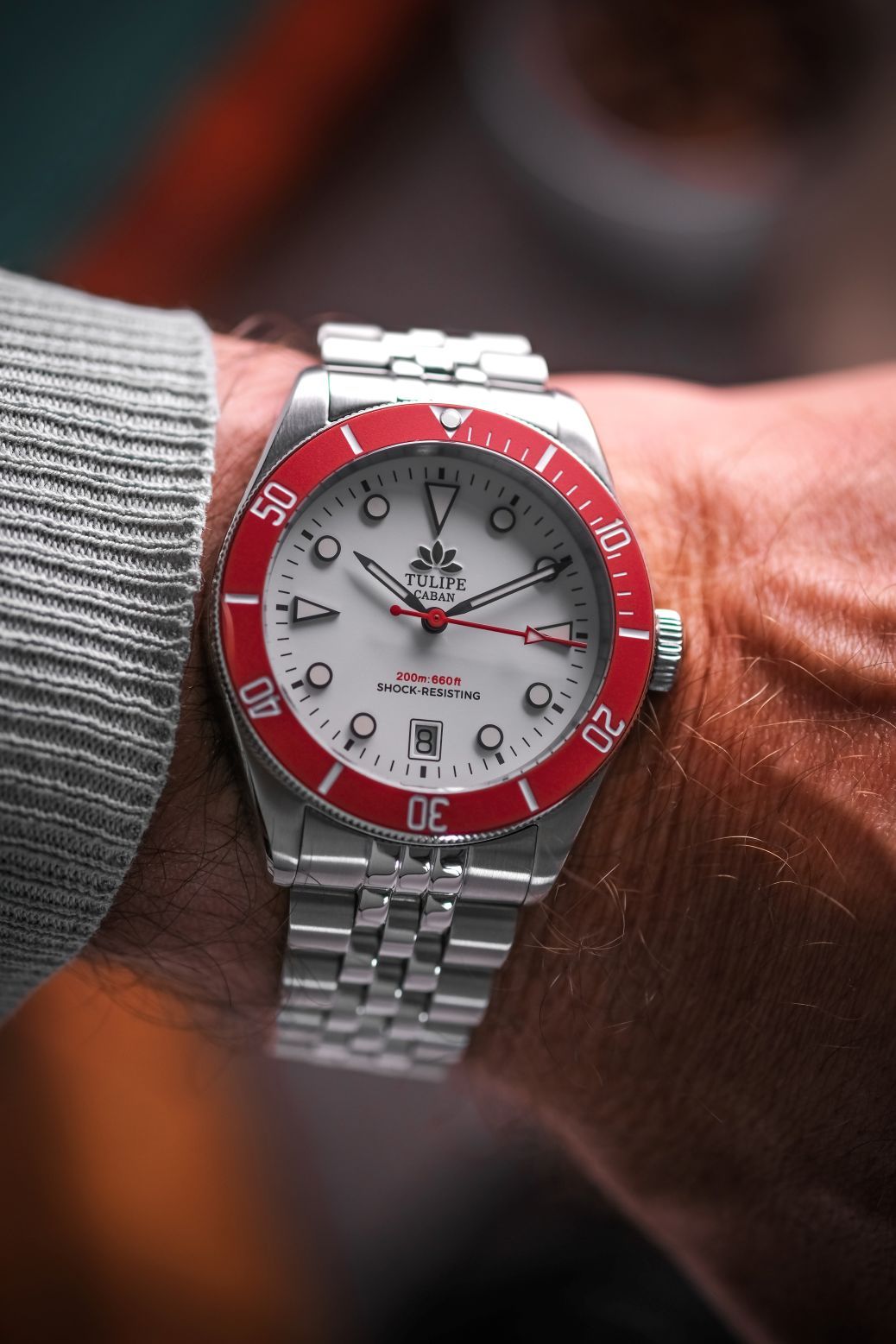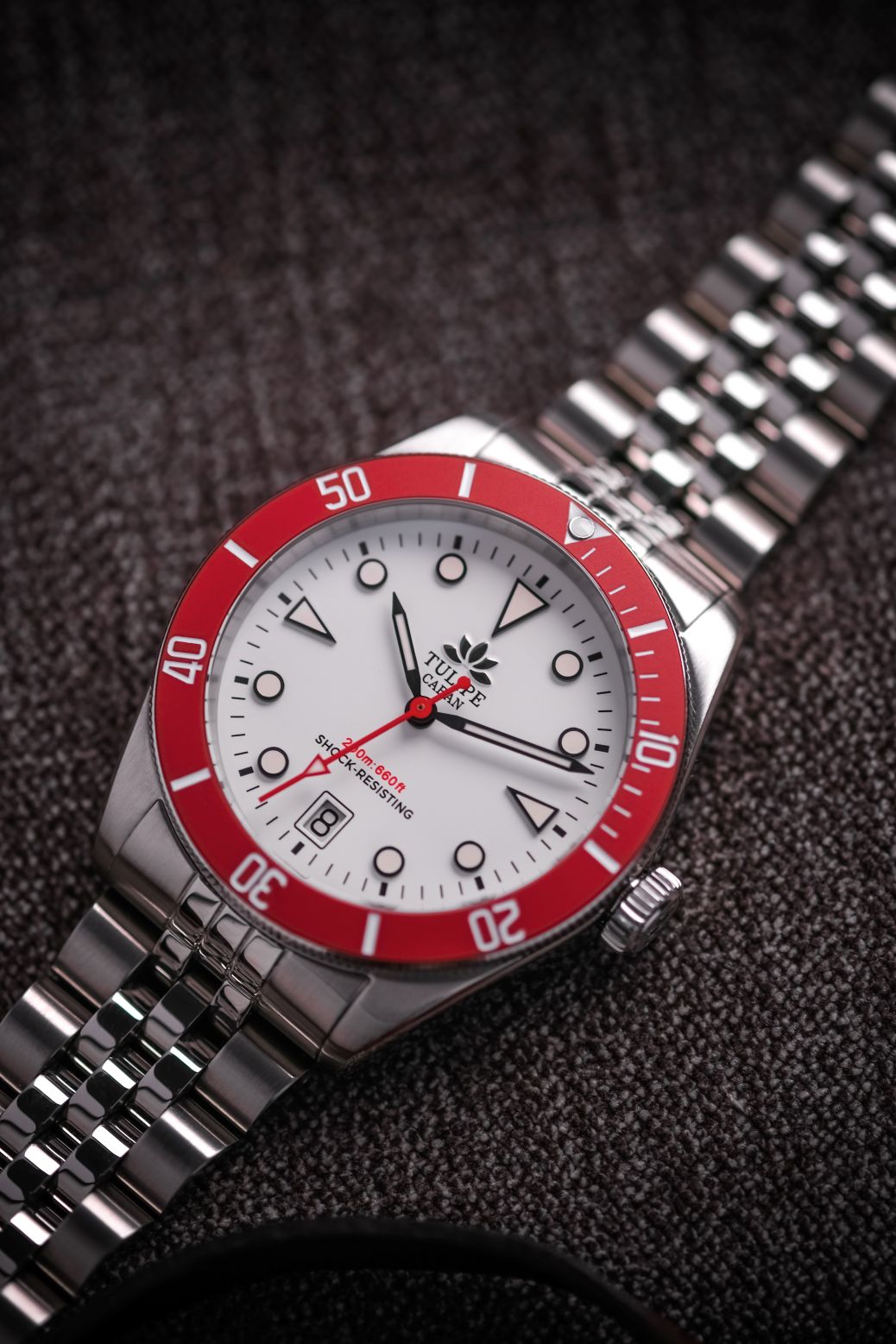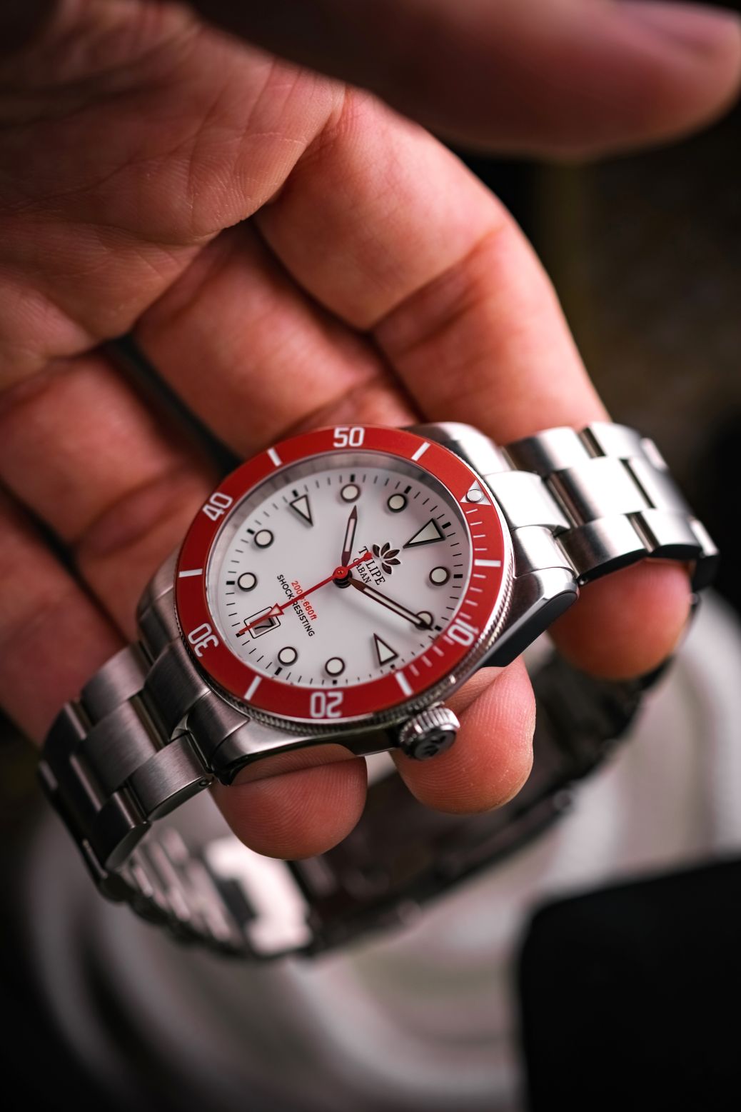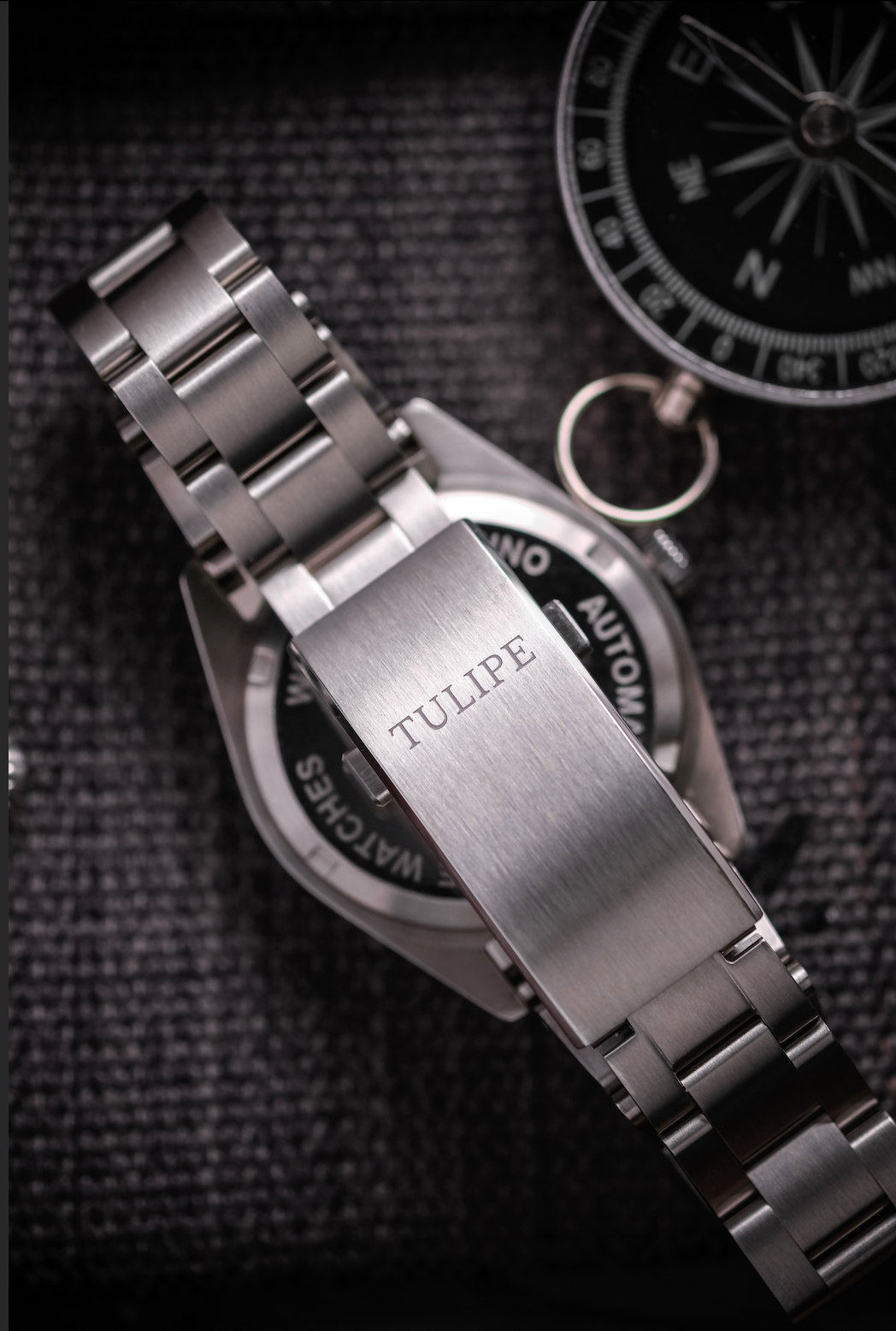 Il primo diver di casa Tulipe reinterpretato con una cassa da 38,5mm , ridotto di spessore, dial bianco ghiaccio, una lunetta in ceramica opaca rossa e con un illuminazione blu in modo da essere leggibile anche nelle condizioni di illuminazione più difficoltose.